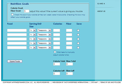 Dieting is a guessing game: if I eat 1200 calories per day, will I gain or lose weight? What if I'm going to all of that effort just to starve myself and reduce my metabolism? With MyFitnessTrainer.com, you'll never have to worry or wonder. Your calorie goal will be determined scientifically, using complicated formulas that track your changing metabolism. One week you might be better off eating 1,500 calories per day, but due to muscle growth next week could require 1,650. If you didn't track your changing metabolism, you could accidentally stunt your progress by starving that muscle! Also, if your calories need to be reduced to give you the maximum results, your program will let you know. On this page, just record your daily calorie and fiber intake. You can record your foods individually, using our nutrition database and saving your most often eaten foods. Or, if you prefer to track your calories and fiber on paper (maybe you're on-the-go and not near a computer during the day,) then you can do so. Just click the button on this screen to manually enter your calories and fiber totals at the end of the day.